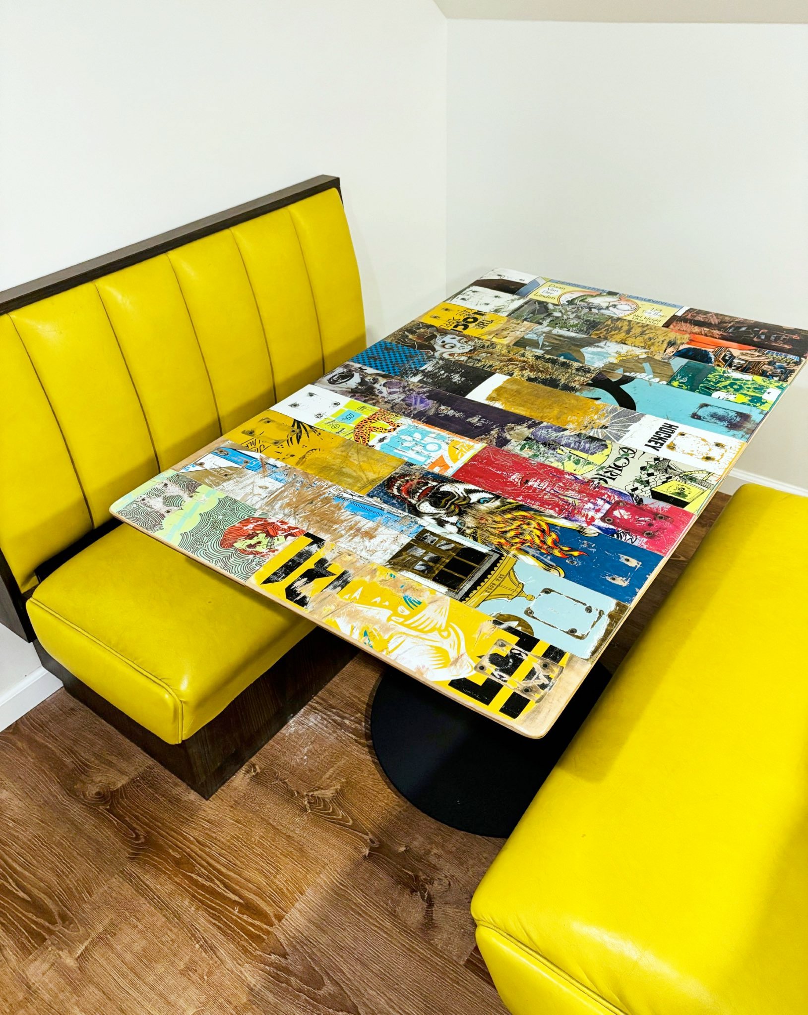 Broken skateboards are ripped into planks and then joined in a single layer to create the sleek and colorful table tops of our Skatecafe line. A hidden reinforcement panel underneath strengthens and ensures a flat surface while the chromed-out steel tablebase brings some bling.